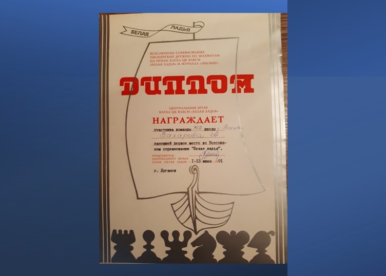Диплом за 2-е место в XXII всесоюзном соревновании "Белая ладья" (Краматорск, 1990 год)