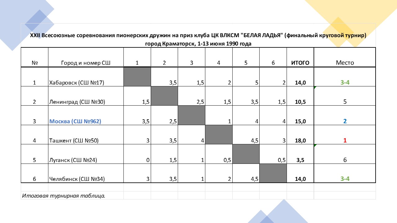 На решение вопроса о составе школы №962 на первую всесоюзную "Белую ладью" у Александра Петровича было примерно полгода. Ввиду ограниченного бюджета в Краматорск (именно этот город Советского Союза был выбран шахматной ареной для пионерских дружин в 1990 году) должны были поехать вместе с тренером пять учеников школы №962 (1976 г.р. и моложе): четыре мальчика и одна девочка. Вариант с запасными игроками даже не рассматривался – это была непозволительная роскошь по тем временам.